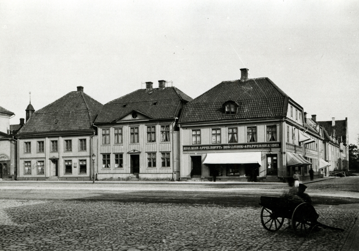 Vy från Stortorget mot kv. Rådmannen. Appeltoffts bokhandel med markis.