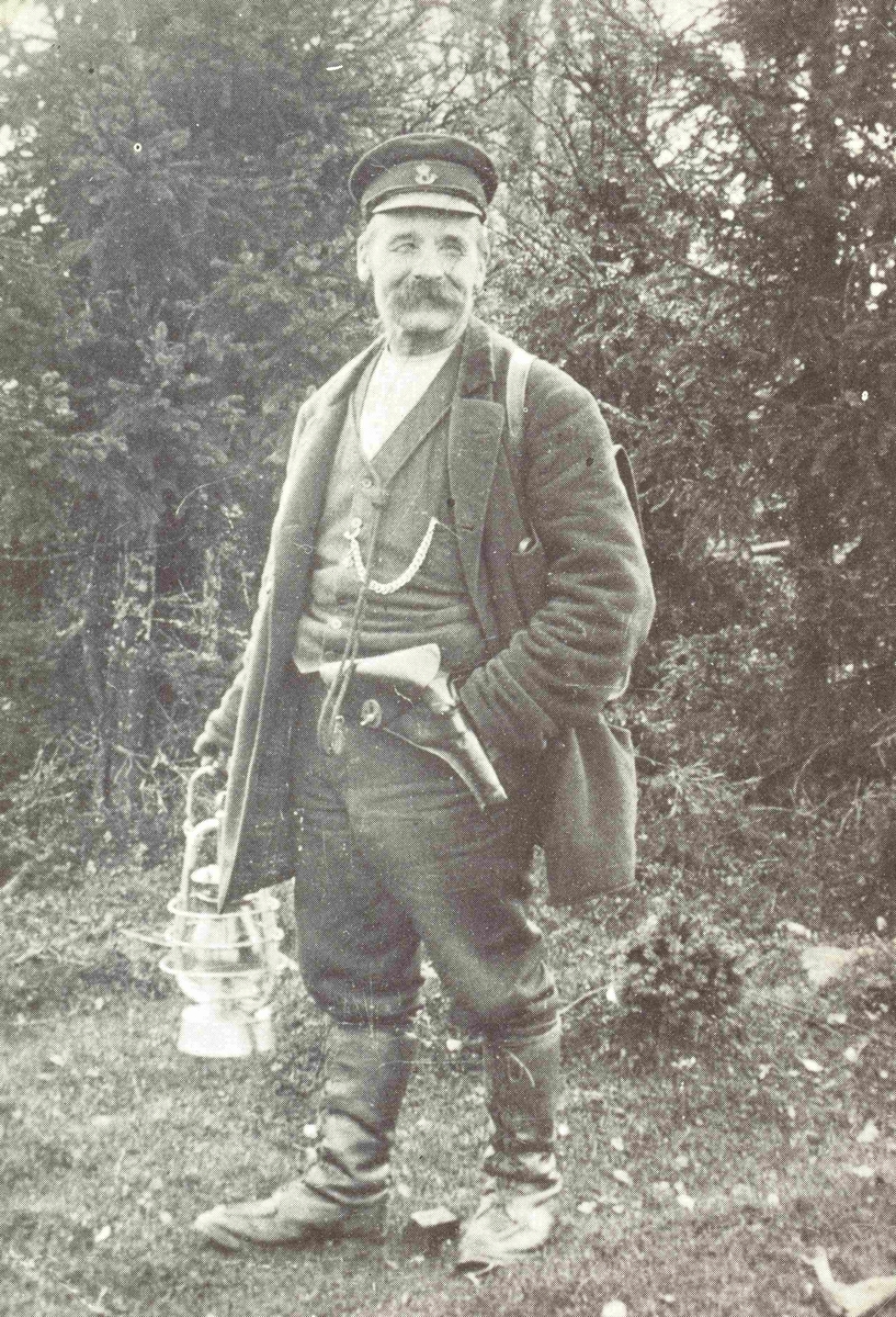Lantbrevbärare från Ljusdalstrakten. Jens Dyssvold, beväpnad med pistol och fotogenlykta gjorde en gång i veckan turen mellan Mellansjö och Vallsjö.