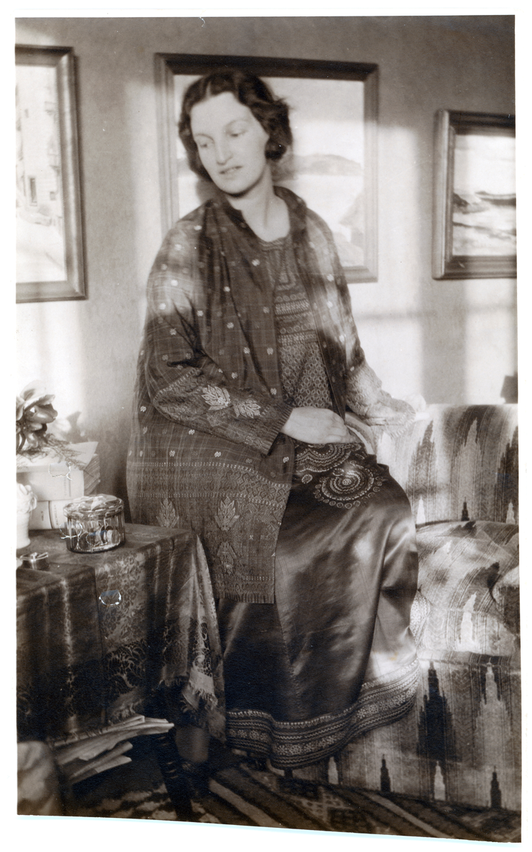 Porträtt av Anna-Lisa Mannheimer-Lunn, en av Bohus Sticknings första formgivare. Solljus faller in på Anna-Lisa och ramade målningar i bakgrunden och en ikat-mönstrad fåtölj. . Hon är klädd i löst sittande klänning och rock i orientaliskt inspirerade mönster.
