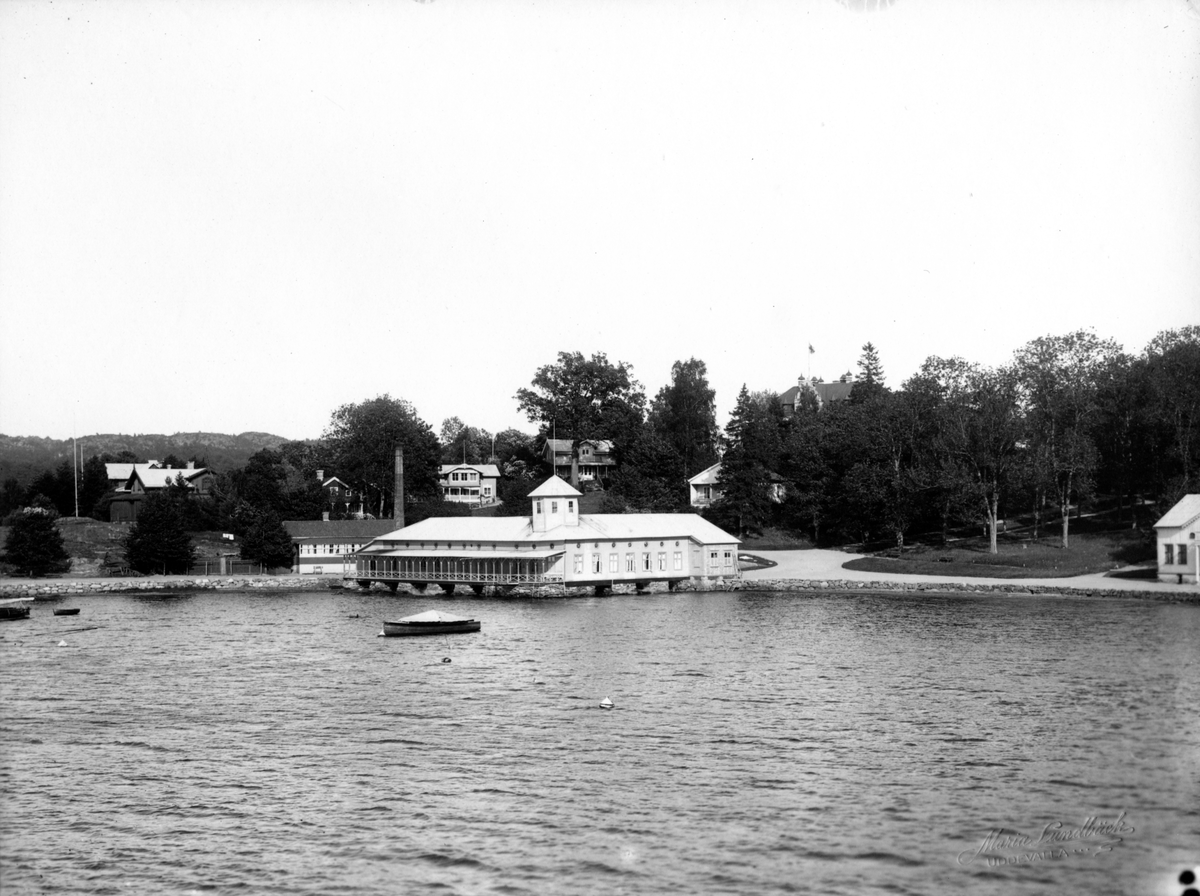 Titel: Enligt tidigare notering: Gustafsberg 1905. Vy viken och byggnader (text på baksidan).