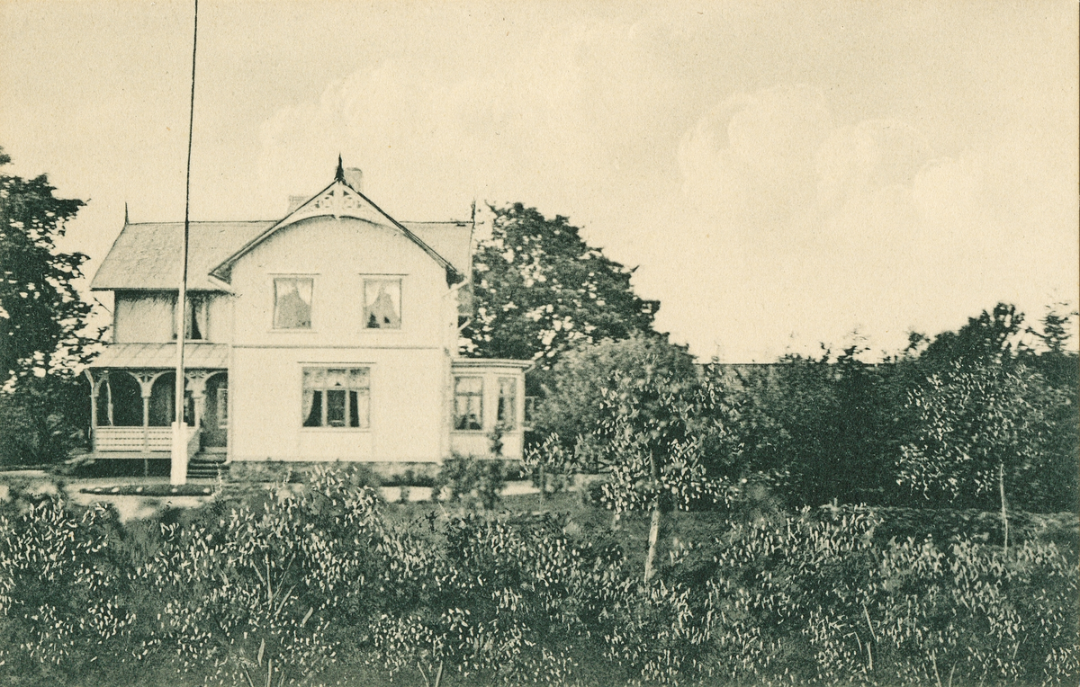 Ett bostadshus med en anlagd trädgård med flaggstång.