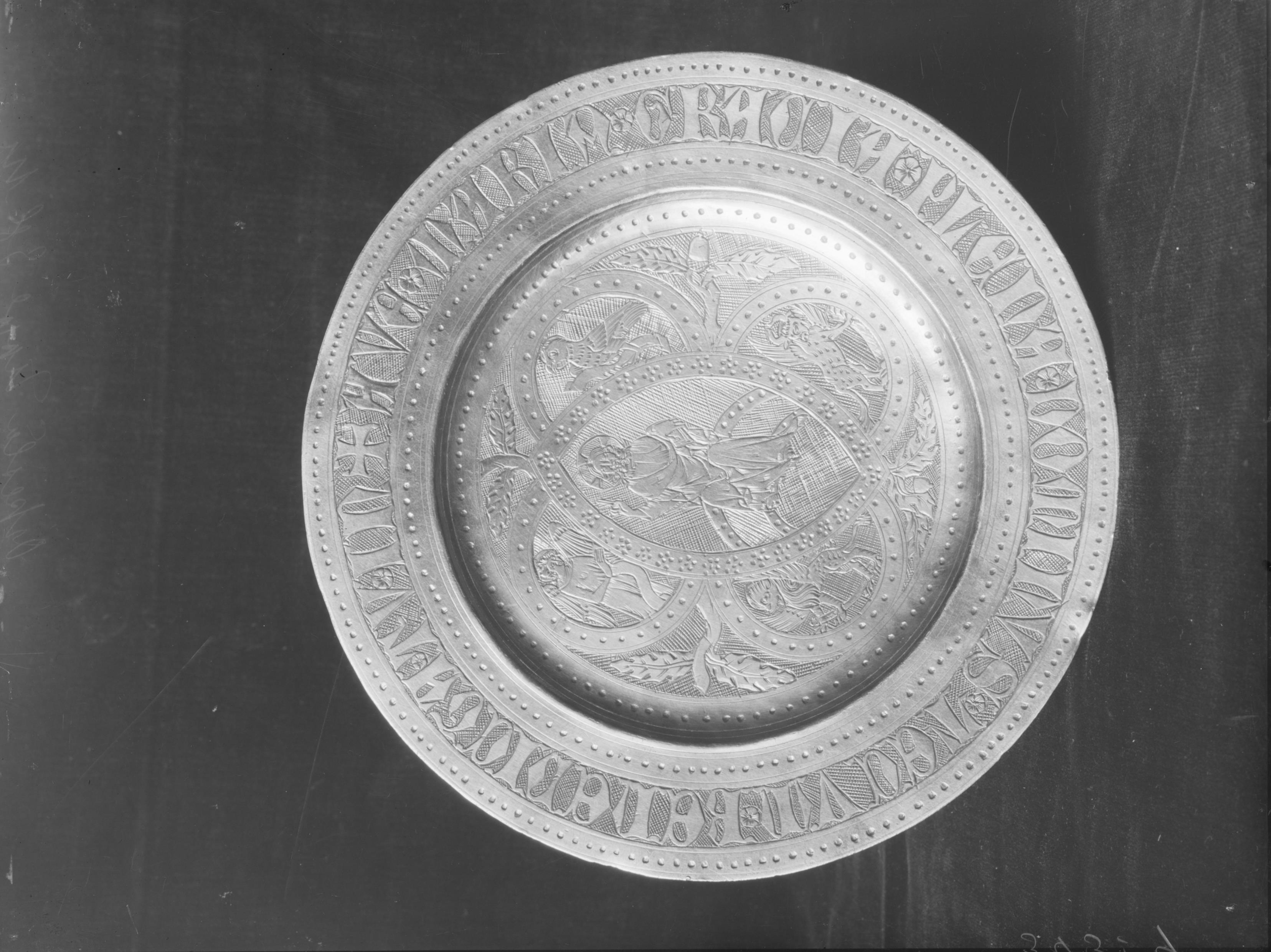 Patén, förgyllt silver, graverad ornering, i botten Kristus med evangelistsymbolerna.