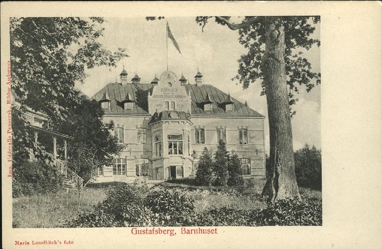 Tryckt text på vykortets framsida: "Gustafsberg, Barnhuset."