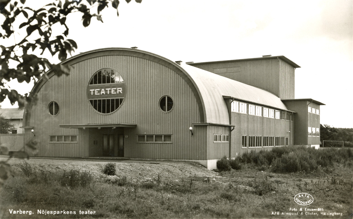 Vykort, "Varberg. Nöjesparkens teater." Teaterbyggnaden invigdes våren 1937 och ses här från entrégaveln. Byggnadsingenjör Åke Arvidsson i Halmstad gjorde ritningarna och byggmästare var John Nilsson. Där kunde man ta emot 760 sittande och 500 stående besökare. Priset var 2,50 kr för de förra och 1 kr för de senare. Teaterns första premiör hölls 1 juni 1937 med operetten "Cirkusprinsessan", av E. Kálmàn, med dåtidens stora operettprimadonna, Ingalill Söderman.