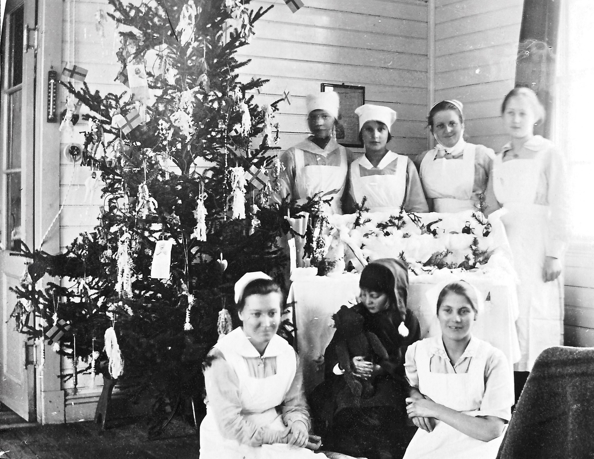 "Julen 1920 på Apelviken." Personal på Kustsanatoriet vid en klädd julgran tillsammans med en tomtenisse som sitter med en nalle.