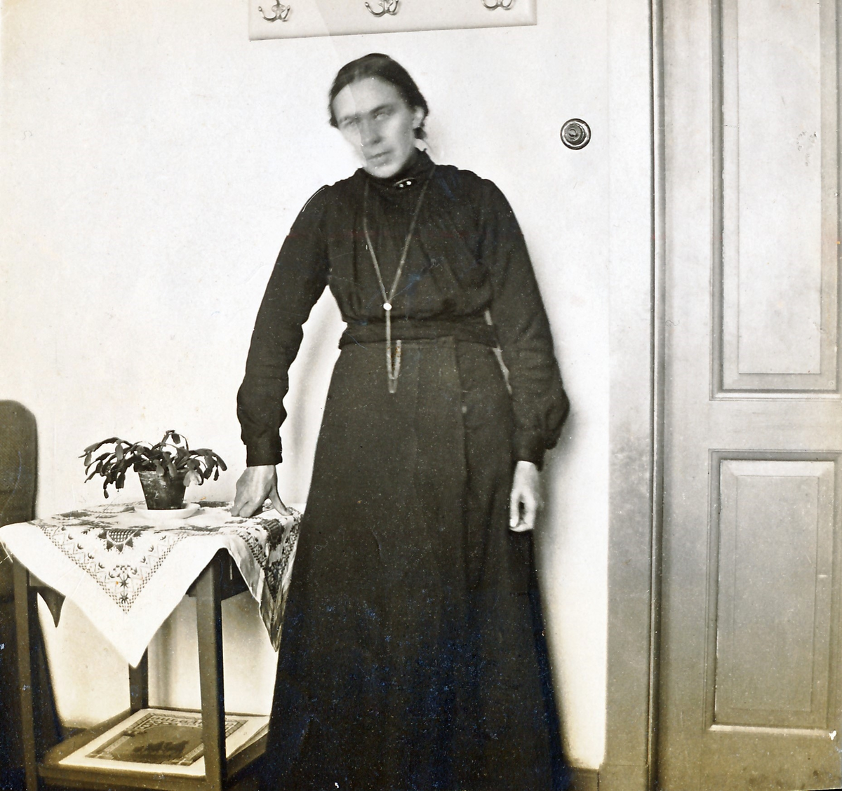 "En för...d kvinna." (Delvis oläslig text.) En mörkt klädd kvinna med lång halsdedja står vid ett bord, täckt av en duk med hallandssöm. På bordet står en novemberkaktus och över kvinnan sitter tre dubbelkrokar.