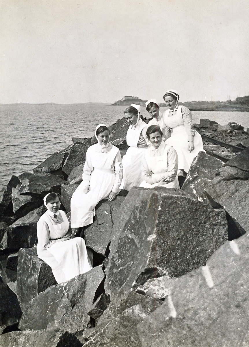 "6 glada systrar bland stenar och block." Samma sjuksystrar vid Kustsanatoriet som på bildnr KSA91 sitter här på sprängsten nere vid vattnet. Ovanpå blocken ligger en godsräls från stenbrottet. I bakgrunden syns Varbergs fästning. (Se även bildnr KSA100, 102.)