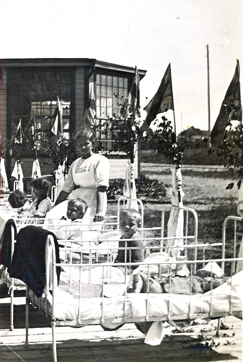 "2ans småbarn med biträde". Kustsanatoriets små patienter utrullade på solaltanen. Vid sängändarna är flaggor och troligen skynken för solskydd fästade. Se bildnr KSA97 för att se hur det ser ut till vänster ur bild.