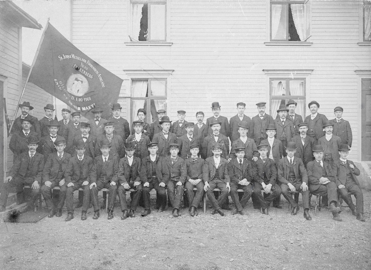 Gruppbild av Svenska Jern-& Metallarbetareförbundet avdelning 69 med en fana utanför gamla Folkets Hus i Falkenberg. Personer på bilden från vänster översta raden: Fredrik Carlsson, Konrad Carlsson, Stenberg, Gustaf Carlsson. Andra raden från vänster: Barthold Nylander. Sittande Bernhard Johansson.