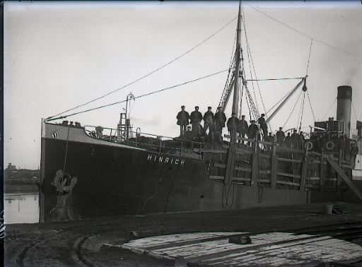 Lastfartyg, Hinrich från Kiel. Ångfartyg, högst sannolikt i Varbergs hamn med full last (eventuellt sten för export). Besättningen står ovanpå lasten. Beställare: Herr Vorhauer. (Se även bildnr GB2_6140.)