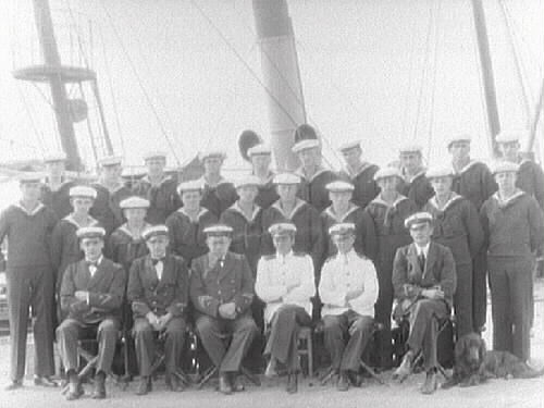 Besättning uppställd på kajen vid örlogs- och sjömätningsfartyget HMS Svalan i Varbergs hamn. Hon byggdes vid Bergsunds Mekaniska Verkstad i Stockholm 1881 (klassad som ångslup) och användes som sjömätare fram till utrangering 1944. Sjömätning innebär uppmätning av havsbottnens topografi och utförs idag av Sjöfartsverket, men tidigare av Sveriges flotta.