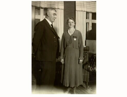 Köpman Oscar Pehrson har just delat ut medaljen "Pro patria" till Helena Johansson för lång och trogen tjänst. Hon arbetade hos honom som biträde under 25 år och öppnades sedan egen affär: "Helena Johanssons speceriaffär" i hörnet Borgmästaregatan-Sveagatan, Kv Falkenbäck. Fototid: 1920-tal.