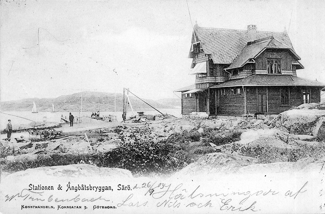 Vykort, "Stationen & Ångbåtsbryggan, Särö." "Konsthandeln, Korsgatan 5 Göteborg". Kortet är daterat 26 september 1903.