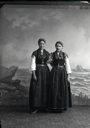 Två flickor stående i helfigur iförda folkdräkt. Beställare: Ada Norrman.