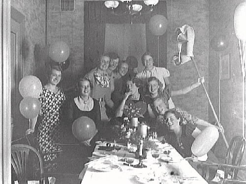 Möhippa för Anna-Greta Bolander (g. Sandberg) som sitter i mitten. De övriga är hennes väninnor, från vänster: Zella Bolander (gift m. brudens bror), Torgerd Johansson (g. Wetterstrand), Harriet Lind, Blanche Bolander (gift med brudens bror, Hedenborg som ogift), Syster Bornebusch, ?, Eva Tideström (Forsén som ogift), Gunvor Laurén (g. Lövgren), Vera Svensson-Warborn (g. Bornebusch), Anna-Greta Sjöblom. Flickorna är i 22-25 års åldern och man hade hyrt in fotografen för att föreviga stunden. Bilden tagen i ett hyrt rum vid sidan av matsalen på Varbergs hotell.