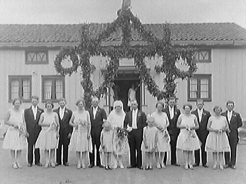 Brudpar med brudnäbbar, tärnor och marsalkar framför äreporten och ingången till ett bostadshus.