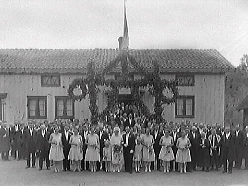 Brudpar med ett stort antal bröllopsgäster framför ett stort hus och en gigantisk äreport.