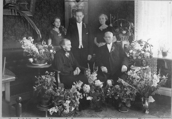 Konduktör Brudin med fru, sonen Erik, dottern Ebba och svärdotter i hemmiljö omgivna av gratulationsblomster. Troligen firas guldbröllop eller födelsedag.