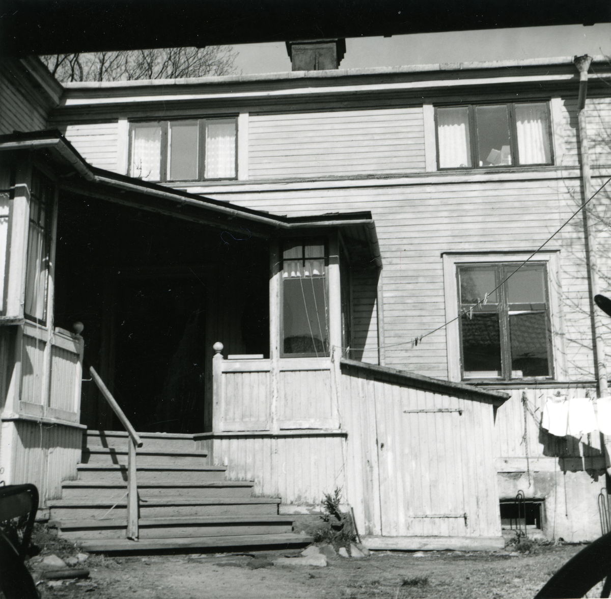 Lilla Kyrkogatan med gårdssidan av Märta Larsonss bageri före rivningen, kvarteret Kyrkbacken 1, Hudiksvall. På bilden syns brokvisten i hörnet samt delar av fasaden. Till höger syns en tvättlina med tvätt på tork.