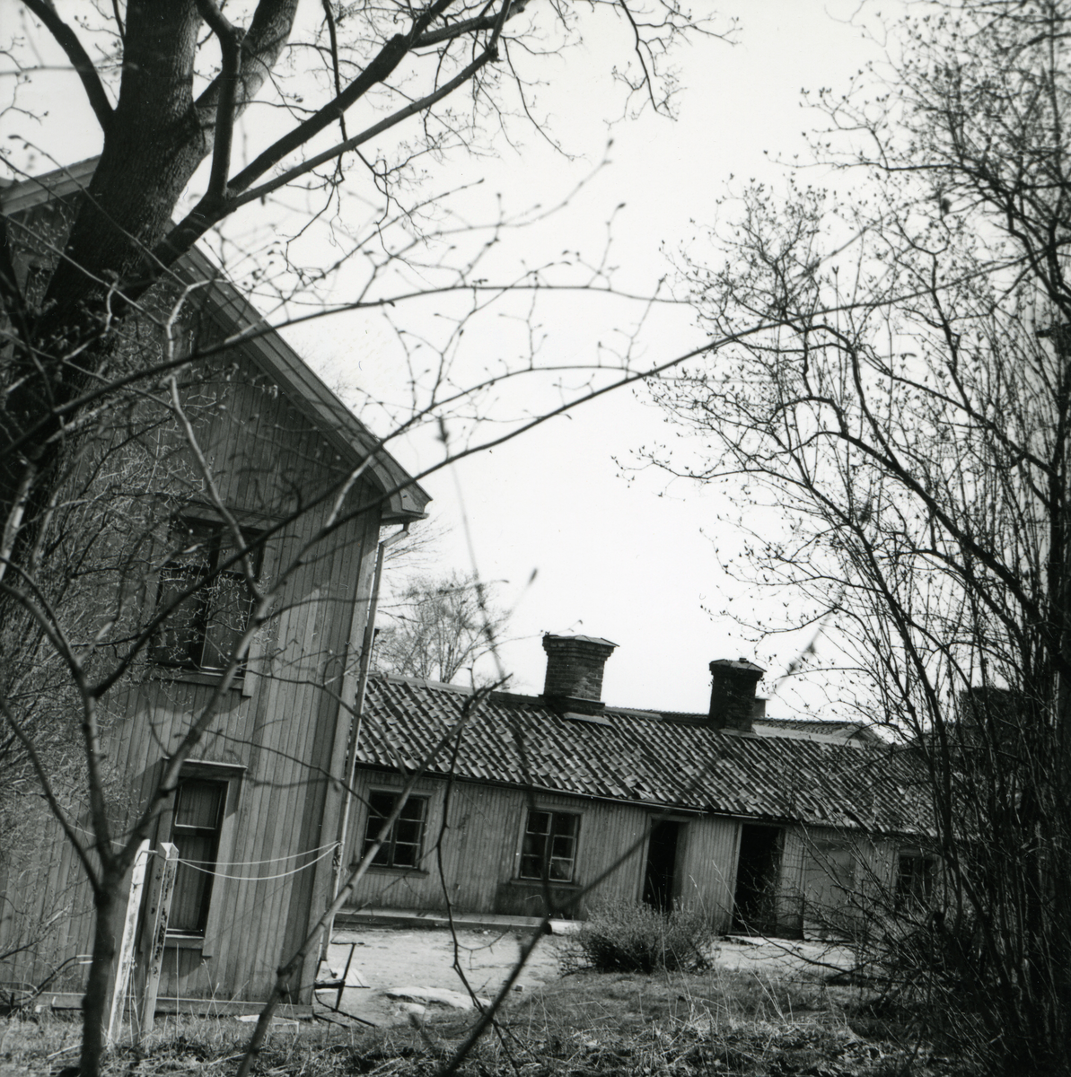Envåningslängan mot Repslagargatan, gårdssidan, i kvarteret Kyrkbacken 2, Hudiksvall. Till vänster syns gaveln på en byggnad i två våningar. I förgrunden anas träd, buskar och gräs.