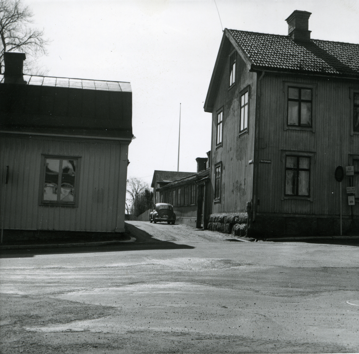Till höger kvarteret Kyrkbacken, Hudiksvall, före rivningen för nytt församlingshem. På bilden syns Repslagargatan där en bil står parkerad utanför den låga huslängan.