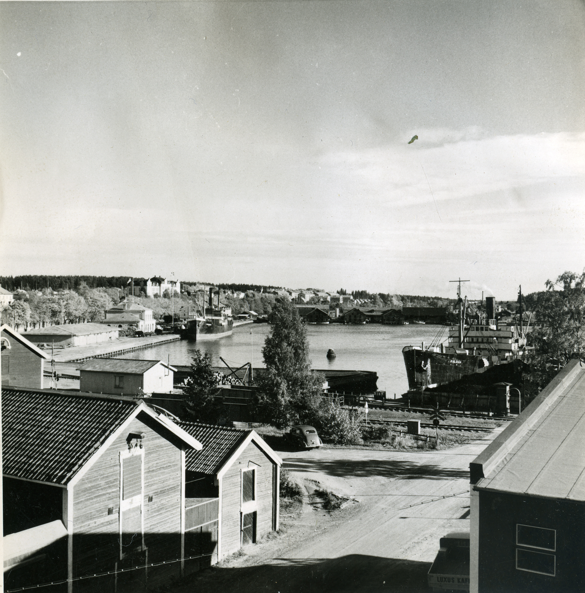 Vy över hamnen, Magasinsgatan, Hudiksvall. I förgrunden till vänster syns två sjöbodar. Bortanför järnvägsspåret ligger ett fartyg invid kajen. I bakgrunden till vänster syns hamnkontoret vid Hamngatan och ett fartyg. Östra Skolan anas ovanför.