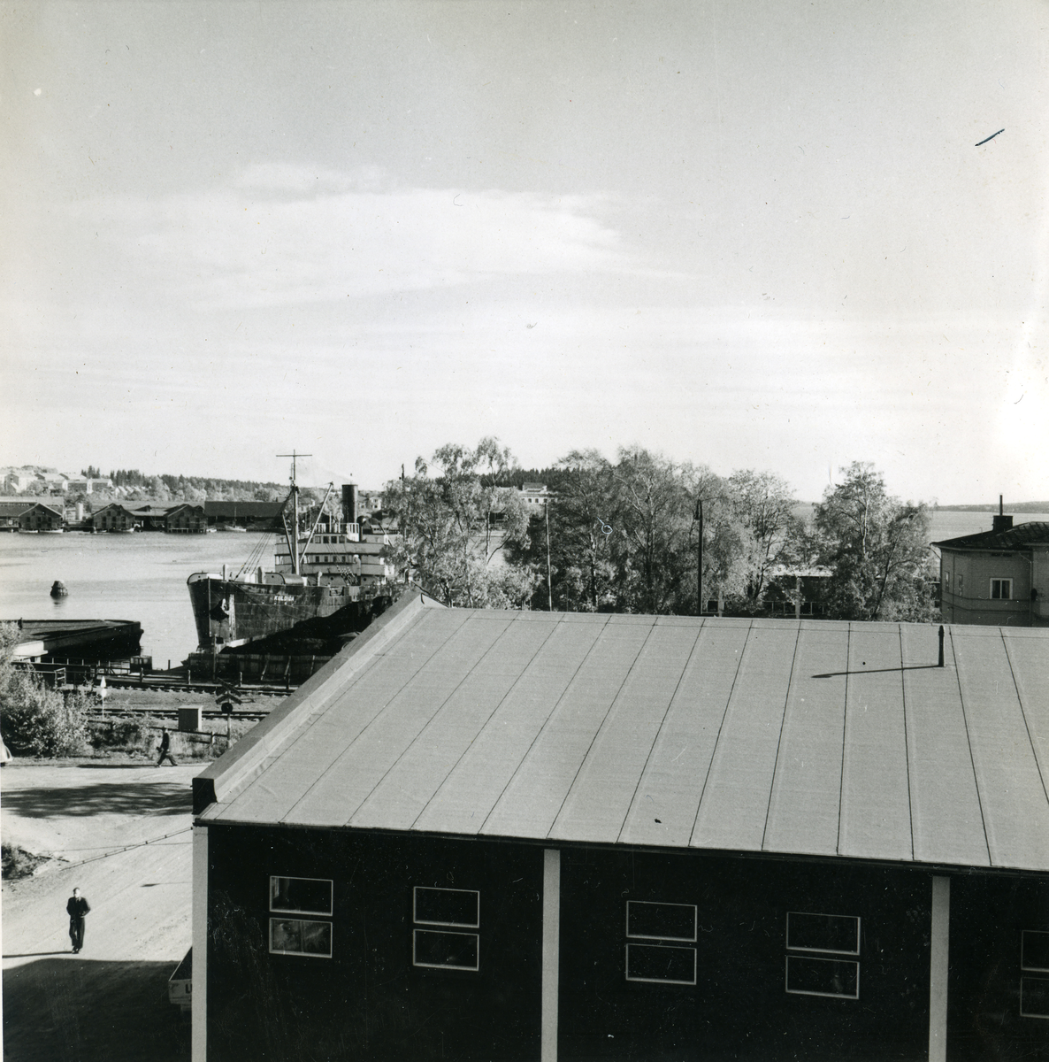 Vy över hamnen, Magasinsgatan, kvarteret Köpmannen, Hudiksvall. I förgrunden syns taket på det så kallade Hakonhuset. Bortanför järnvägsspåret ligger ett fartyg invid kajen. Till höger syns en del av gamla stationshuset. I bakgrunden till vänster, på andra sidan vattnet, syns sjöbodarna vid Sjögatan.