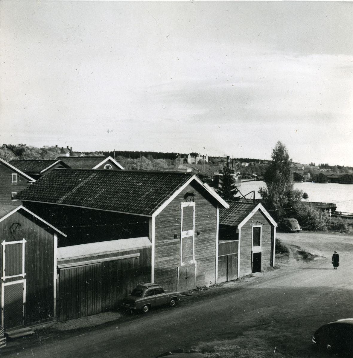 Tre sjöbodar vid Magasinsgatan, kvarteret Köpmannen, Hudiksvall. En bil står parkerad utmed väggen och en ensam person kommer gående från hamnen. I bakgrunden till vänster syns sjöbodarna på andra sidan Sundskanalen. Östra Skolan anas i fjärran.
