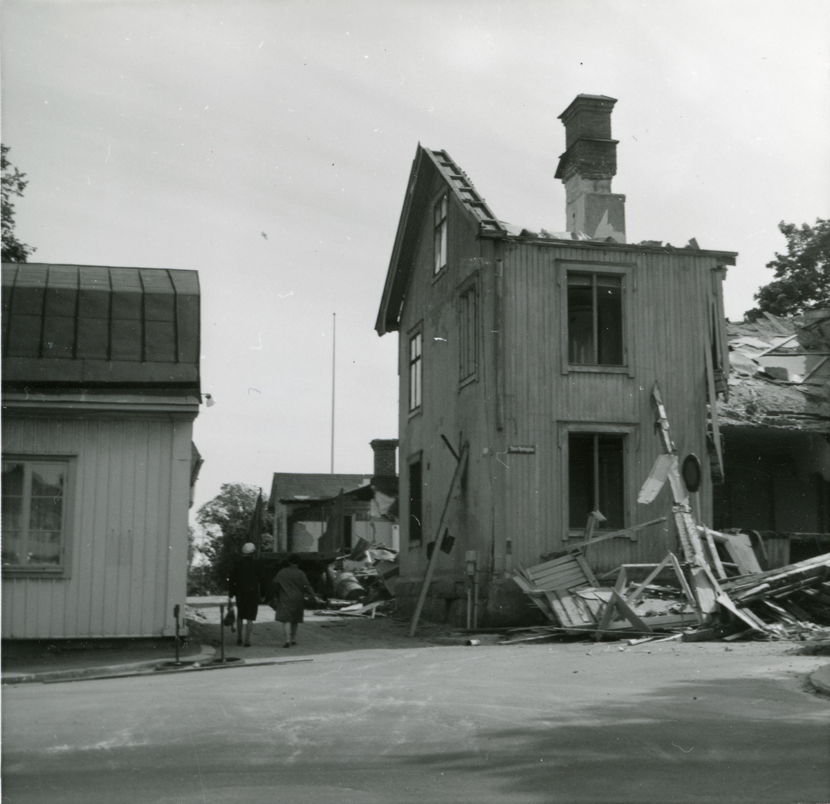 Rivningshus i kvarteret Kyrkbacken 2, Hudiksvall. En gavel och skorstenen står fortfarande kvar. Till vänster syns prästgården. Två personer går mellan byggnaderna.
