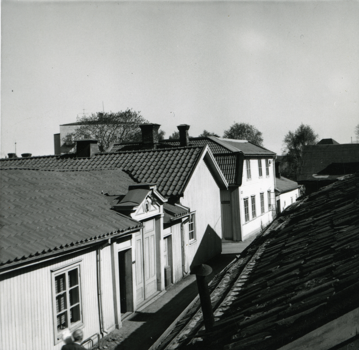 Repslagargatan mot söder, i kvarteret Kyrkbacken 2, Hudiksvall. Till vänster syns en låg byggnad med en stor port. I förgrunden ett tegeltak med skorstensrör.