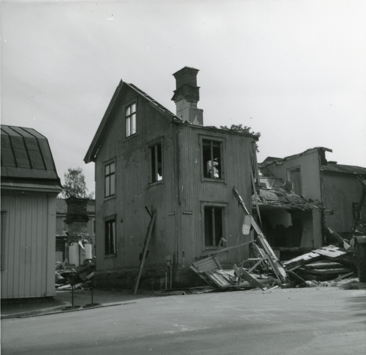 Gavel på ett rivningshus i kvarteret Kyrkbacken 2, Hudiksvall. Till vänster syns hörnet på prästgården.