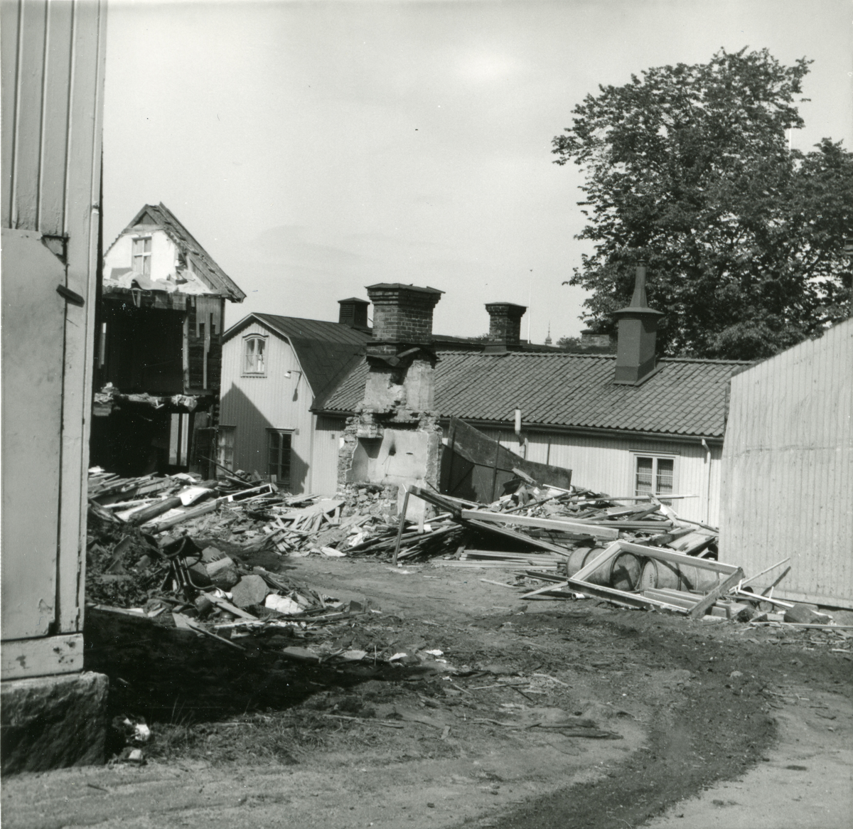 Rivningshus i kvarteret Kyrkbacken 2, Hudiksvall. I bakgrunden syns Prästgården.