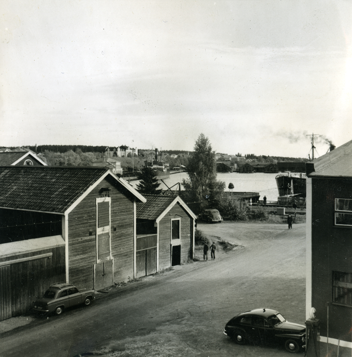 Två sjöbodar vid Magasinsgatan, kvarteret Köpmannen, Hudiksvall. En bil står parkerad utmed väggen. Till vänster i bakgrunden syns taket på en sjöbod på andra sidan Sundskanalen. Östra Skolan anas i fjärran. Fören på ett fartyg syns till höger vid kajen, på andra sidan järnvägsspåret. I förgrunden står en bil parkerad.