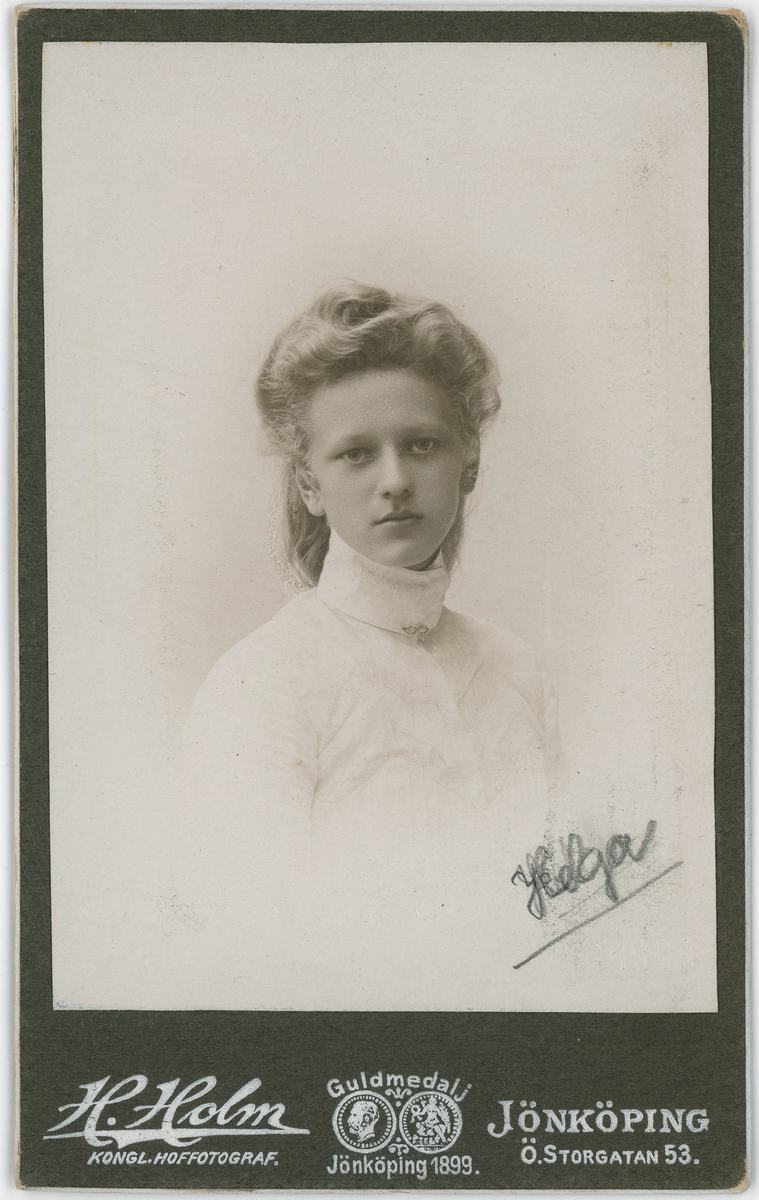 Porträtt på Helga Synnergren. (dotter till förgyllare Synnergren). Atelje i Lund för kyrkliga textilier