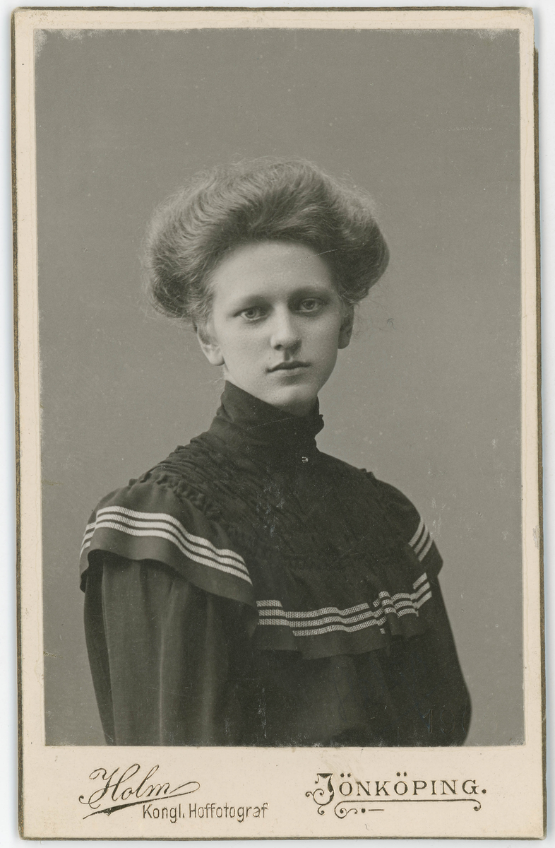 Porträtt på Helga Synnergren. (dotter till förgyllare Synnergren). Atelje i Lund för kyrkliga textilier.