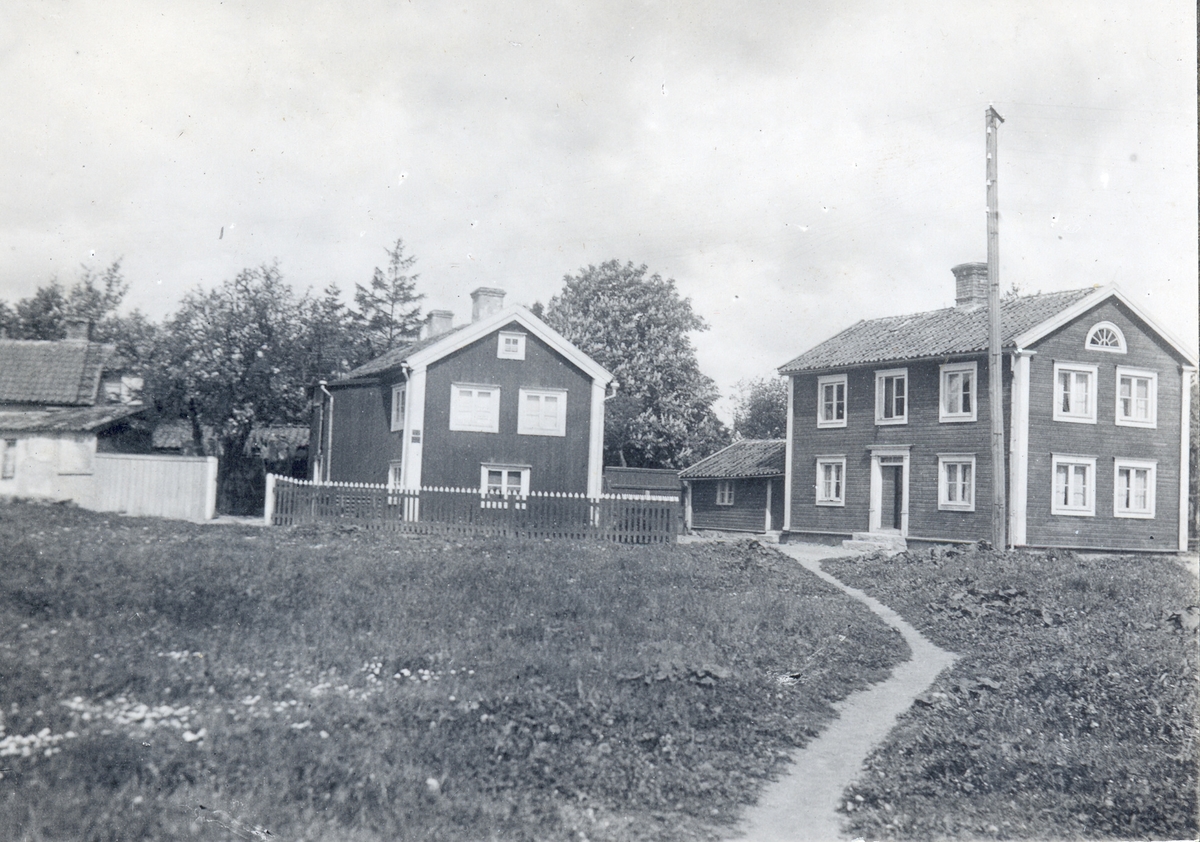 Gullbrandsonska lyckan. Bostadshus med sadeltak och träfasad. En stig leder in mot byggnaderna.