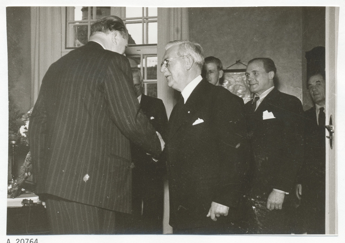 Landshövding Ruben Wagnsson till vänster. Andre man till höger skräddaren Jonas Öberg och närmast dörren redaktör Mauritz Kalmar 1950-talet.