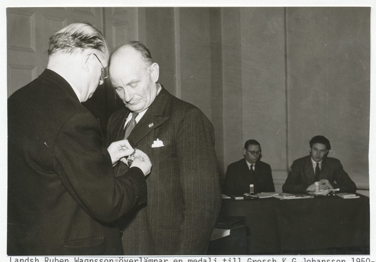 Landshövding Ruben Wagnsson överlämnar en medalj till grosshandlare K G Johansson 1950-talet.