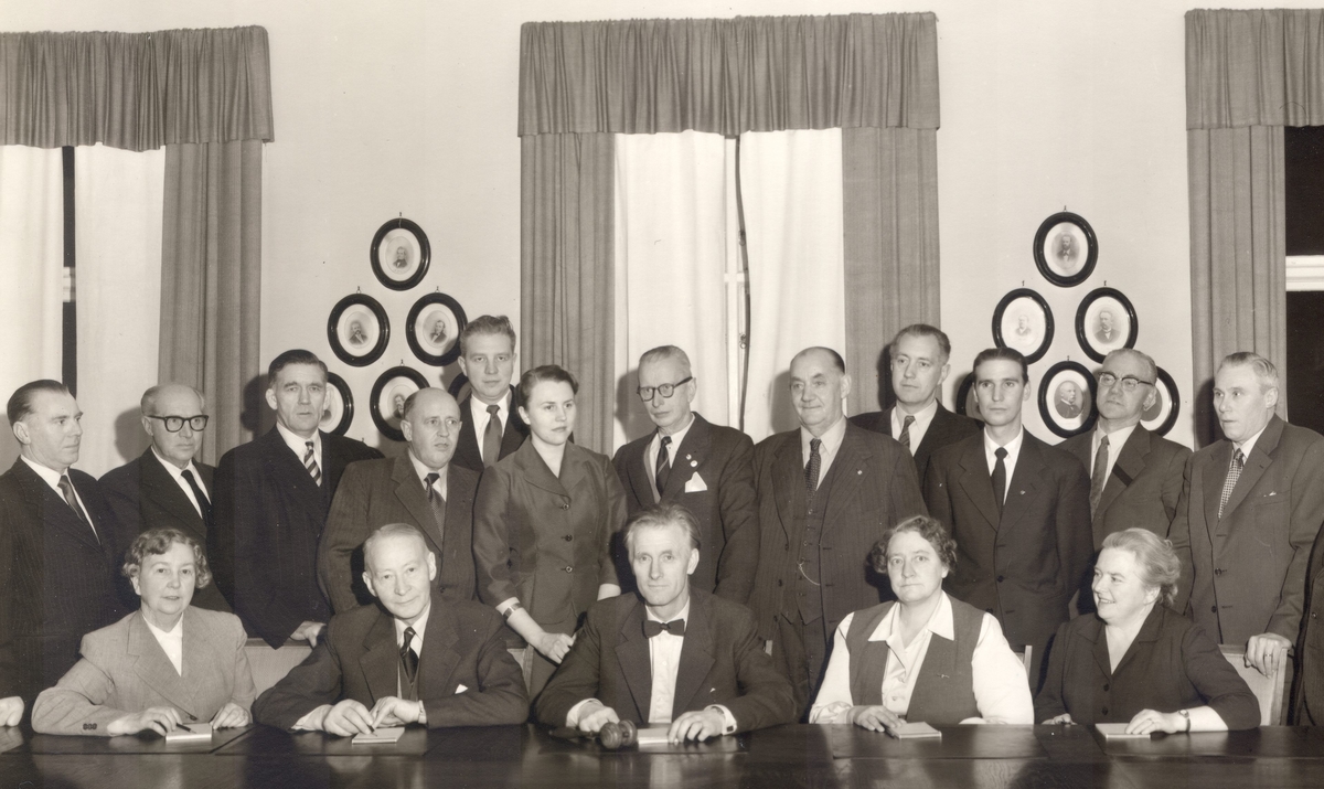Socialnämnd jämte tjänstemän, sammanträder på sessionssalen i stadshuset.