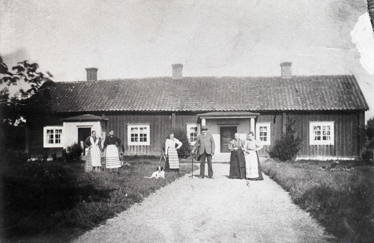 Människor framför hus. När fotografikonsten blev mer spridd blev det vanligt att ta familjeporträtt framför boningshuset. Det är vanligt att de familjenära husdjuren, häst, hund och katt är med.