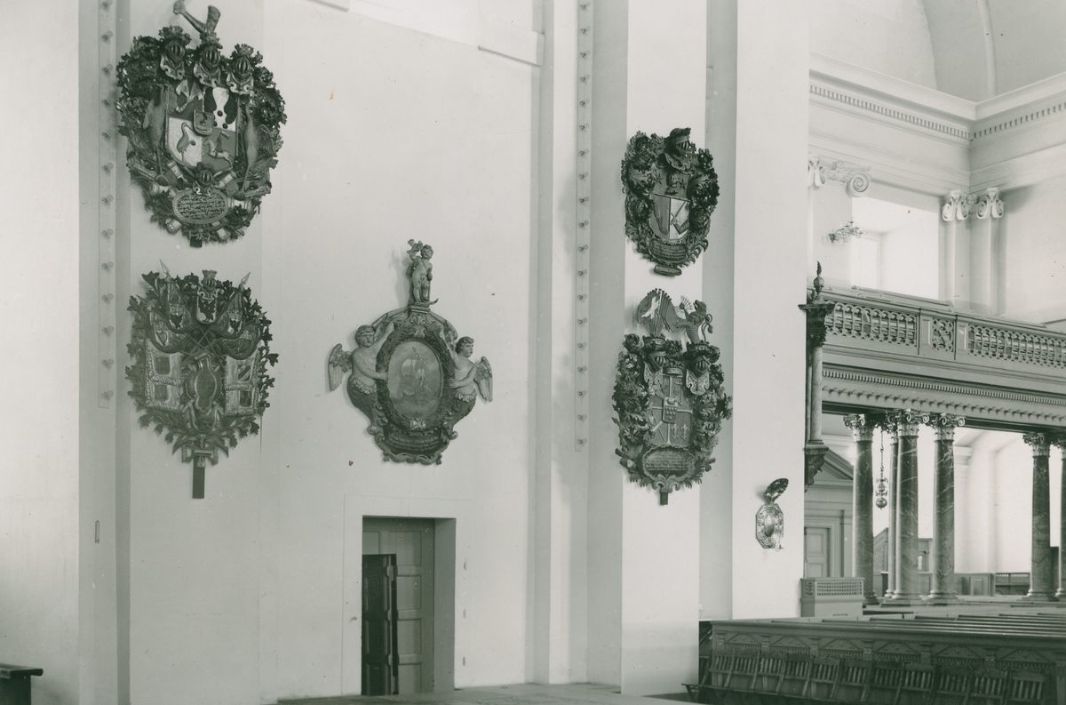 Epitafier och begravningsvapen i Kalmar domkyrka. Över dörren till Kristofferkoret hänger holmmajoren Anders Hommans epitafium. Han var en av de få som överlevde sänknningen av Svärdet 1676. Epitafiet flankeras av landshövding Bleckert Wachtmeisters huvudbanér och anvapen.
