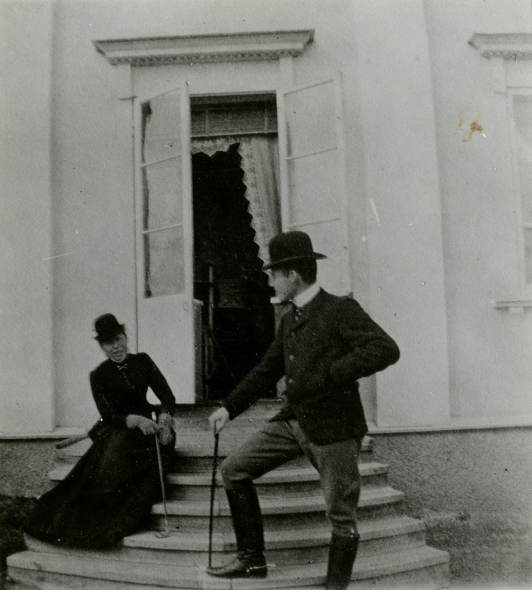 Emy Stålhammar, född Nordström. Född 16/8 1869. Emy Nordström och löjtnant Folke Rudelius utanför dörren till trädgården på baksidan av Ålhults corps-de-logis.