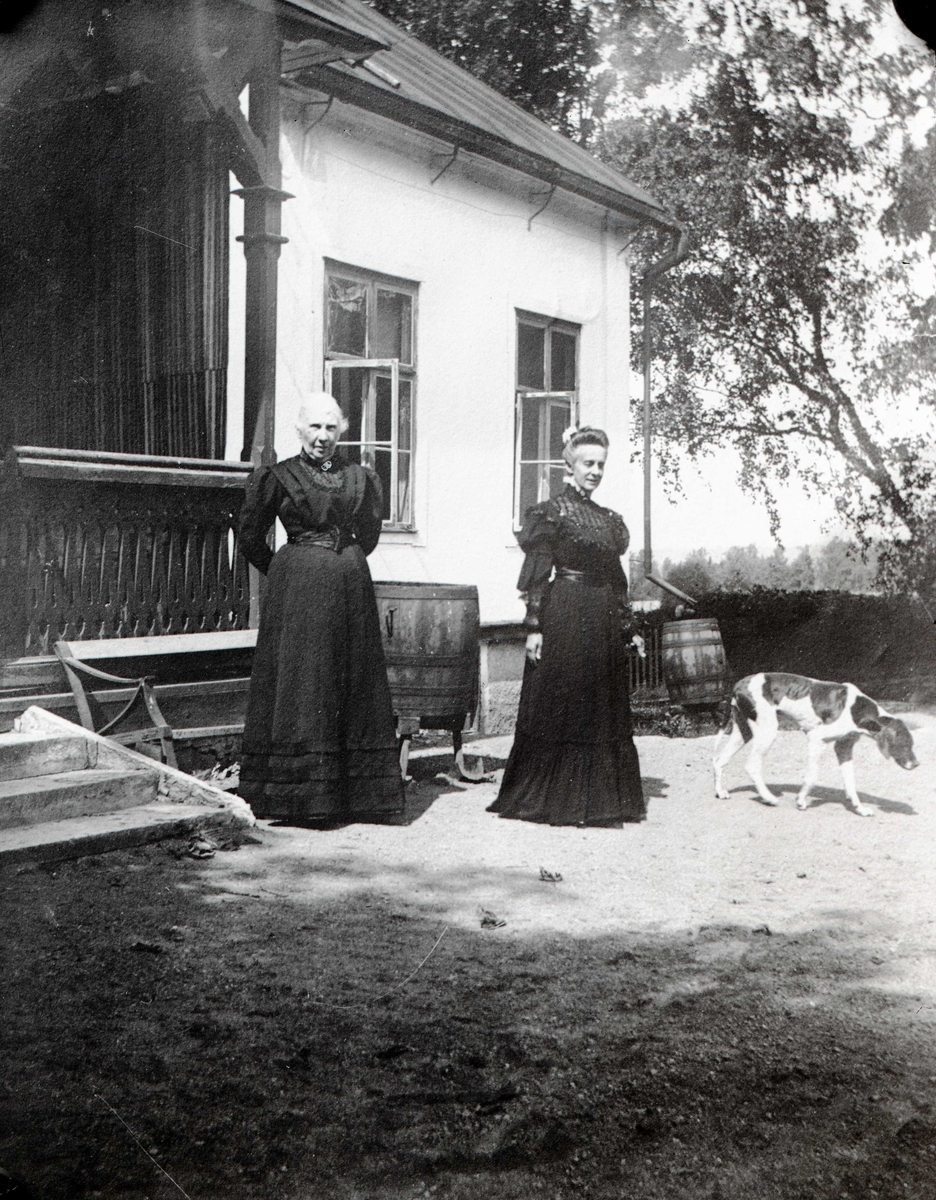 Två kvinnor vid trappa utanför hus.