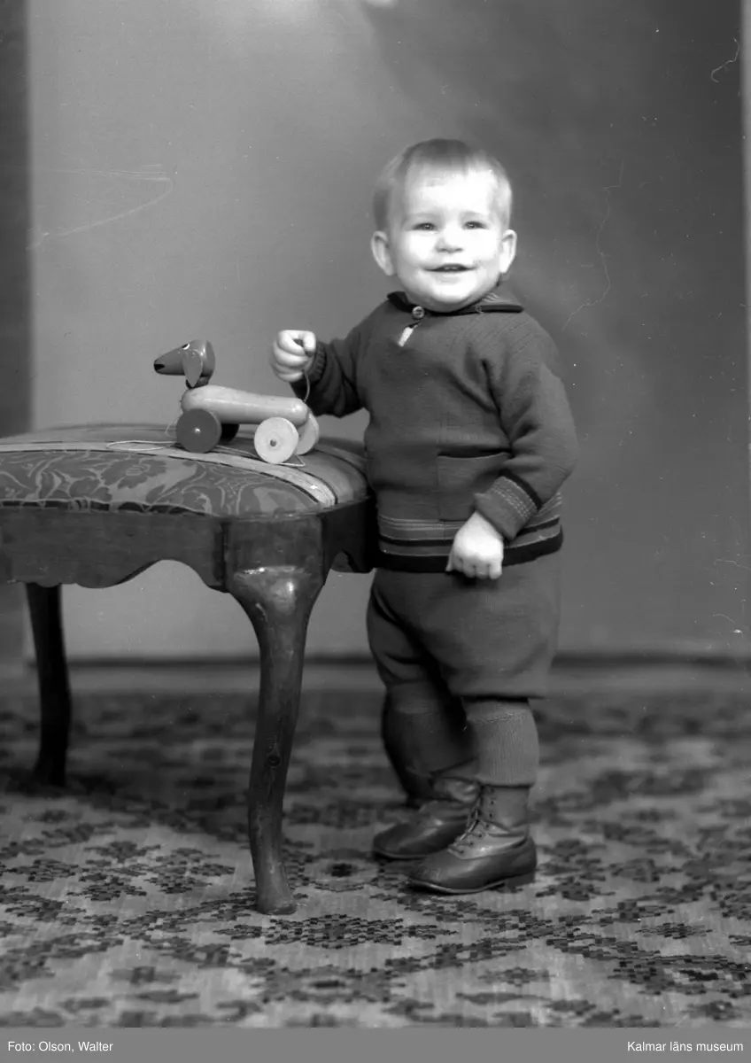 Ateljéfoto. Liten pojke med leksak.