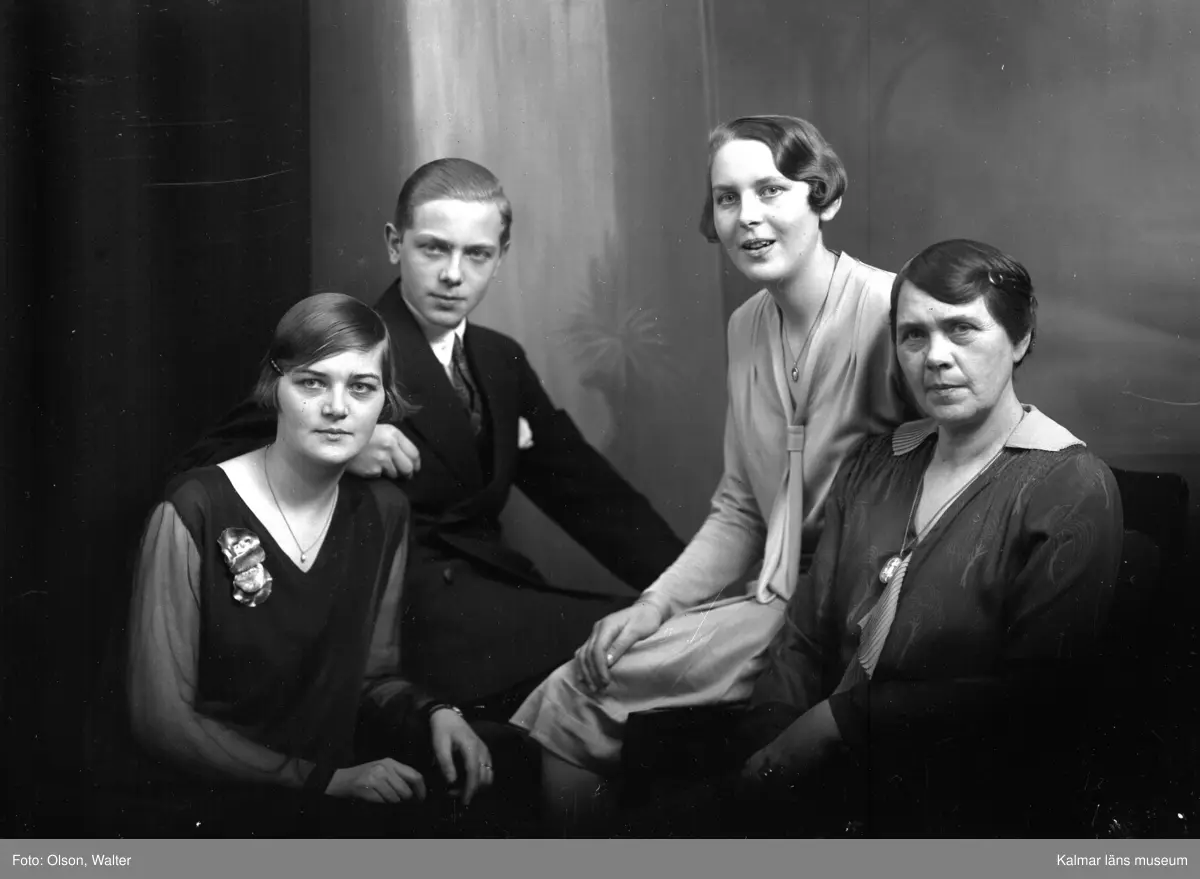 Gruppbild i ateljé. Enligt Walter Olsons journal är bilden beställd av fru Engström ifrån Sandby. Kalmar läns museum känner inte till om den personen är avbildad.