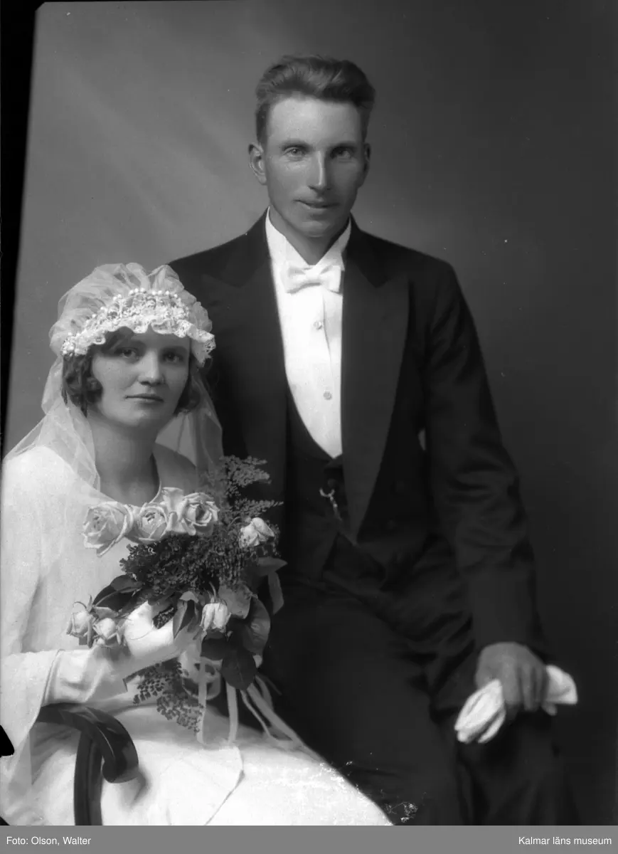 Ateljébild på ett brudpar. Kvinnan har brudklänning och slöja samt blombukett. Enligt Walter Olsons journal är bilden beställd av Enoc Abrahamsson.