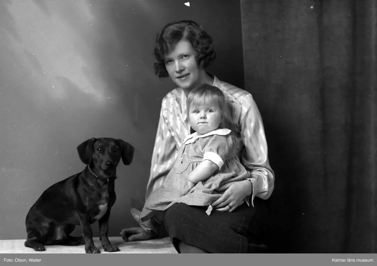 Ateljébild på en kvinna med barn och hund. Enligt Walter Olsons journal är bilden beställd av fru Bjelking.
