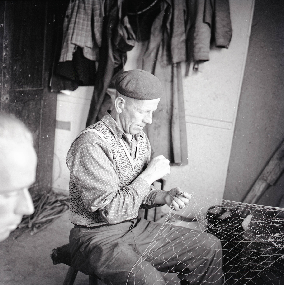 En man som lagar ett fiskenät på Stensö fiskeläge.