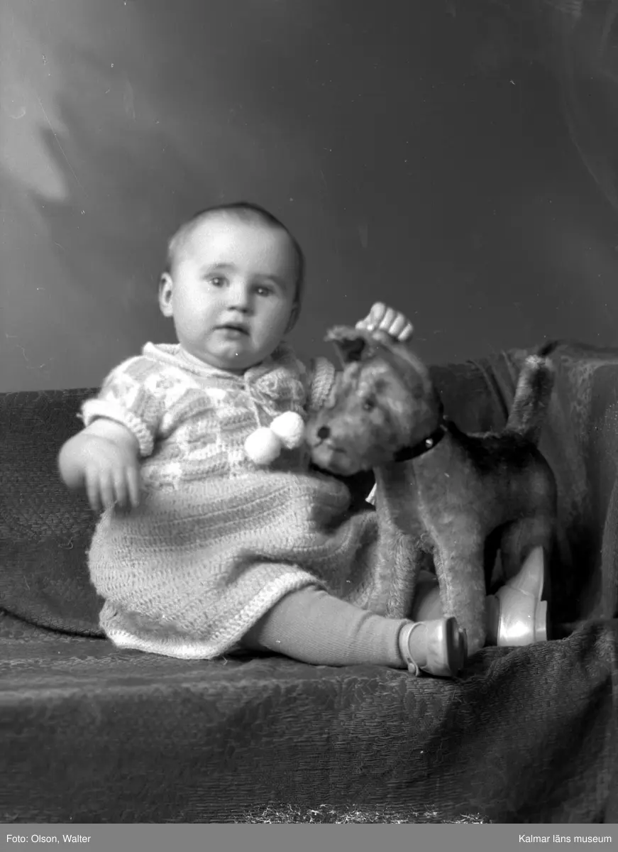 Ateljéfoto. Liten flicka med leksakshund.