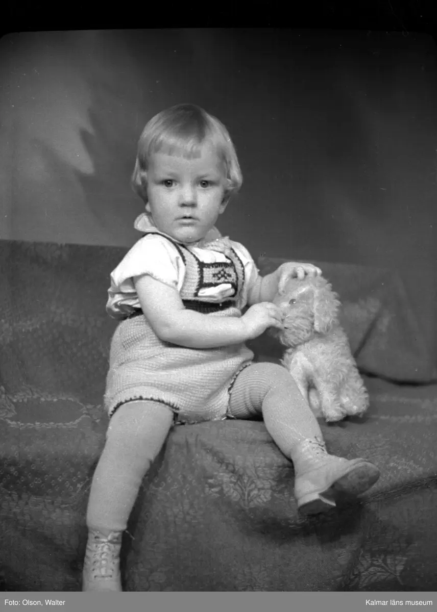 Ateljéfoto. Liten pojke med leksakshund.